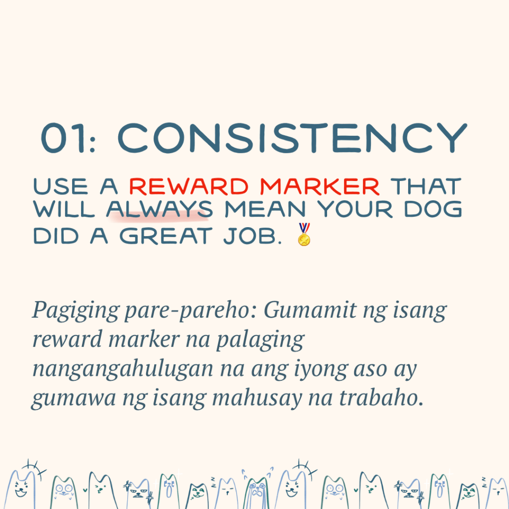 - Consistency – Use a reward marker that will ALWAYS mean they did a great job. A reward marker can be a clicker, a verbal marker (Yes!), clapping, tone, and the like.