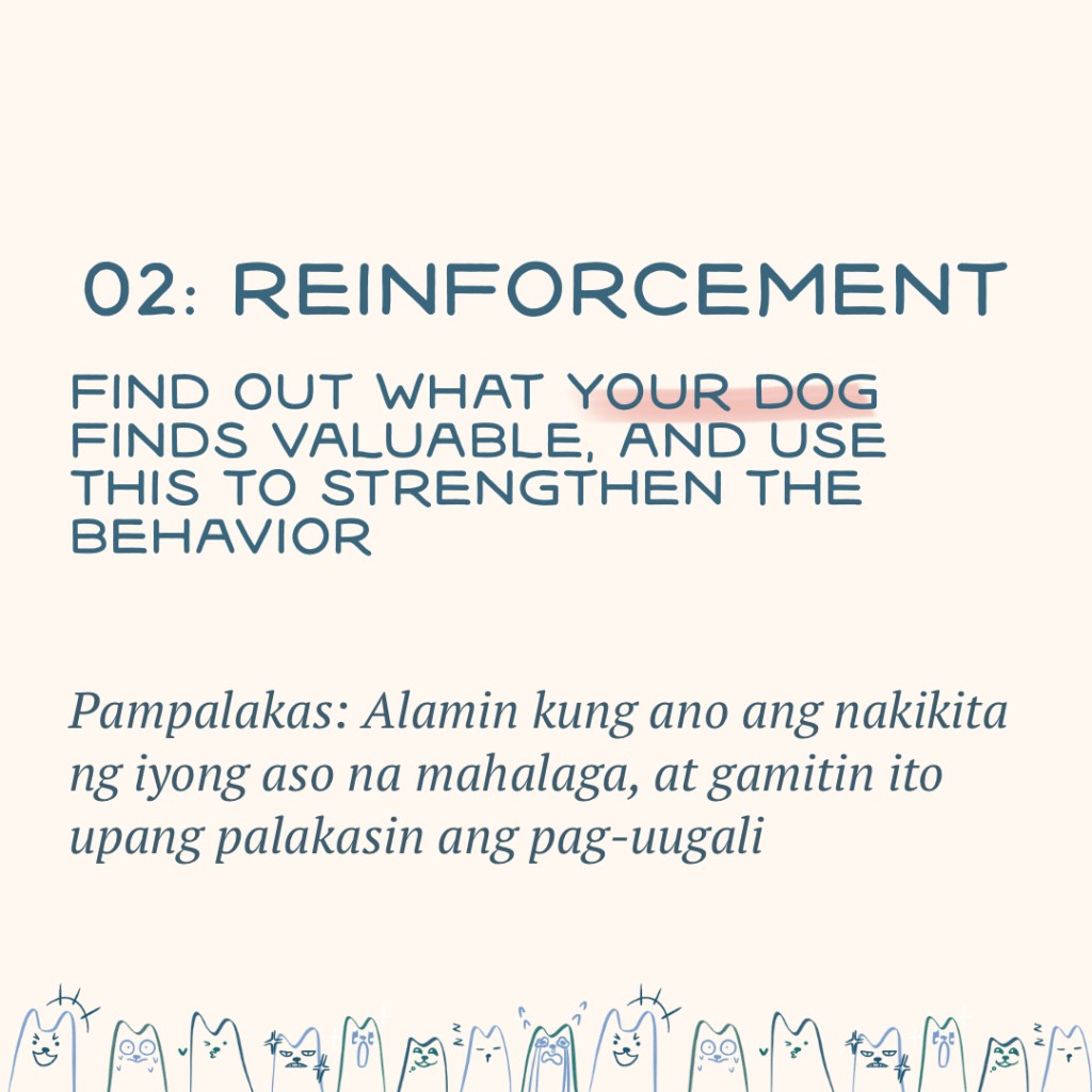 - Reinforcement – Your dog is the only one who decides what’s reinforcing for them. Find out what YOUR DOG finds valuable, and use this to strengthen the behavior.
