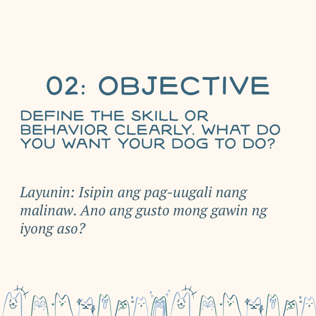 - Objective – Define the skill or behavior you want to build or reinforce in your dog. What do you want your dog to do?
