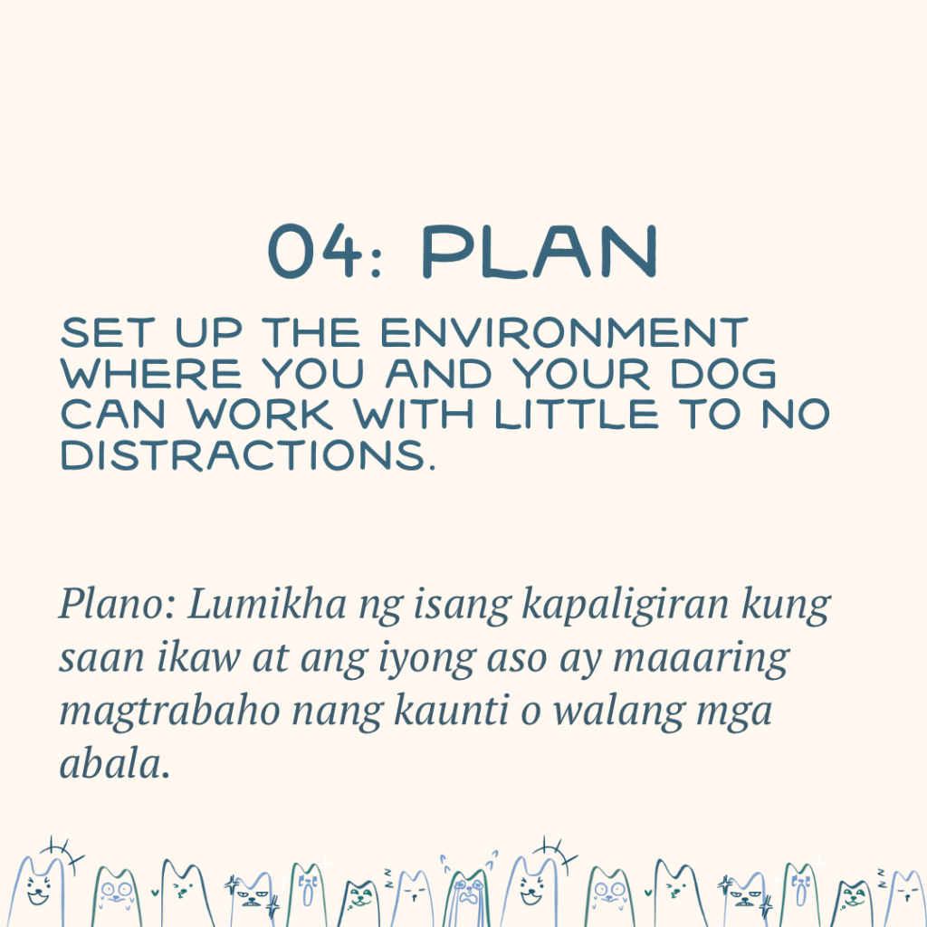 - Plan – Set up the environment where you and your dog can work with little to no distractions, so you’re both always successful.